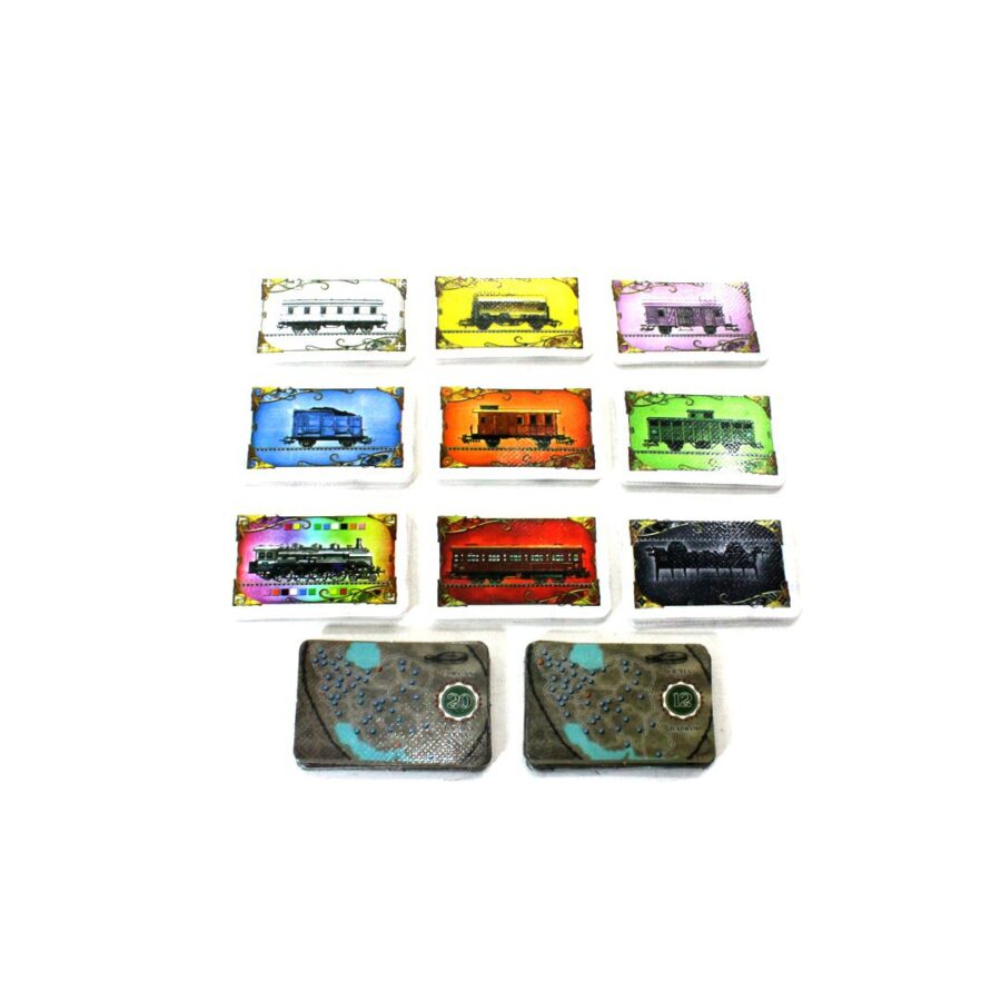 محتویات بسته: صفحه بازی، کارتها، قطعات شخصیتها، قطار، پول و طلا