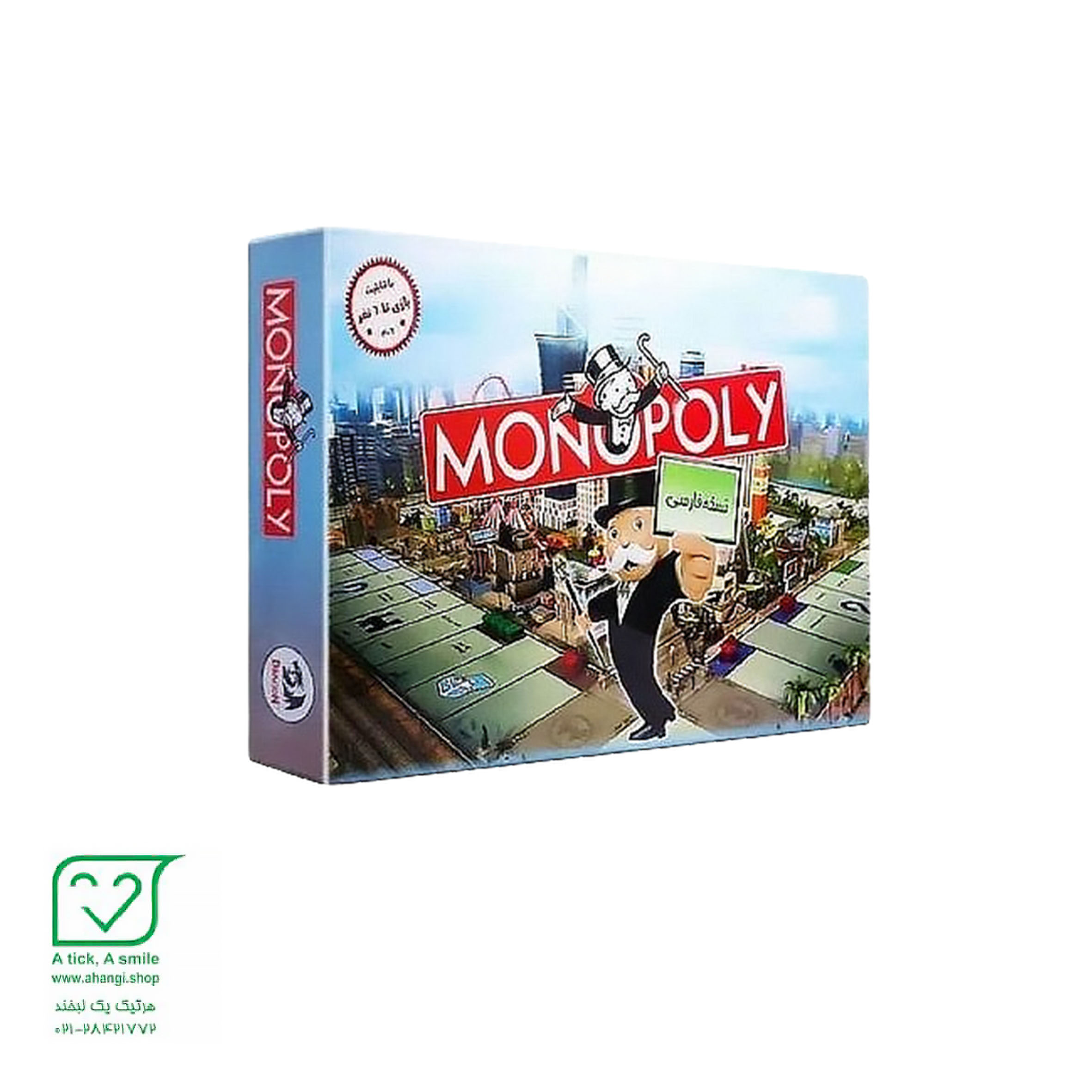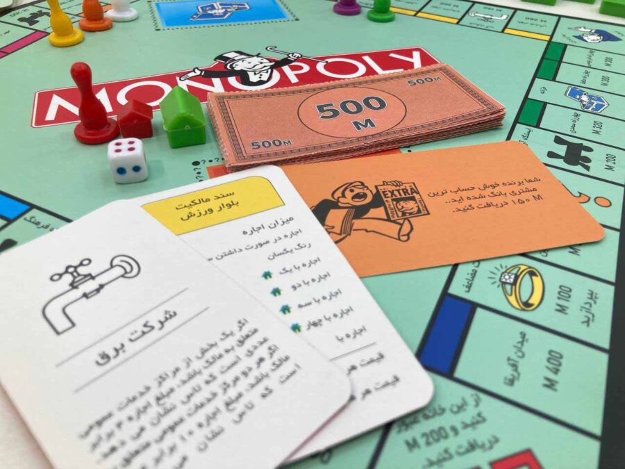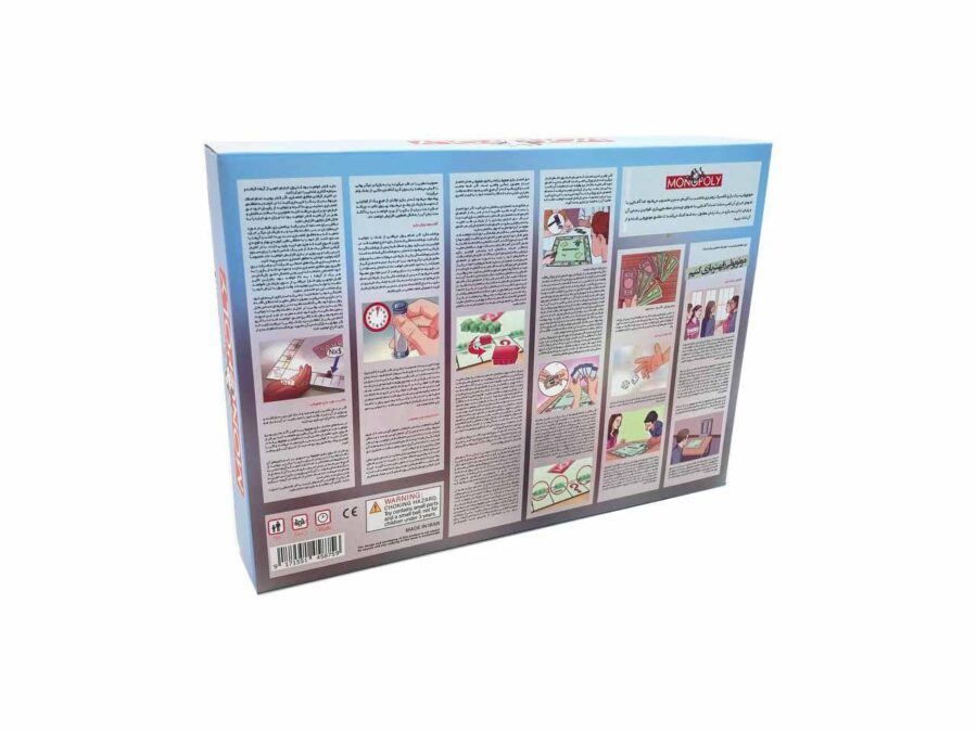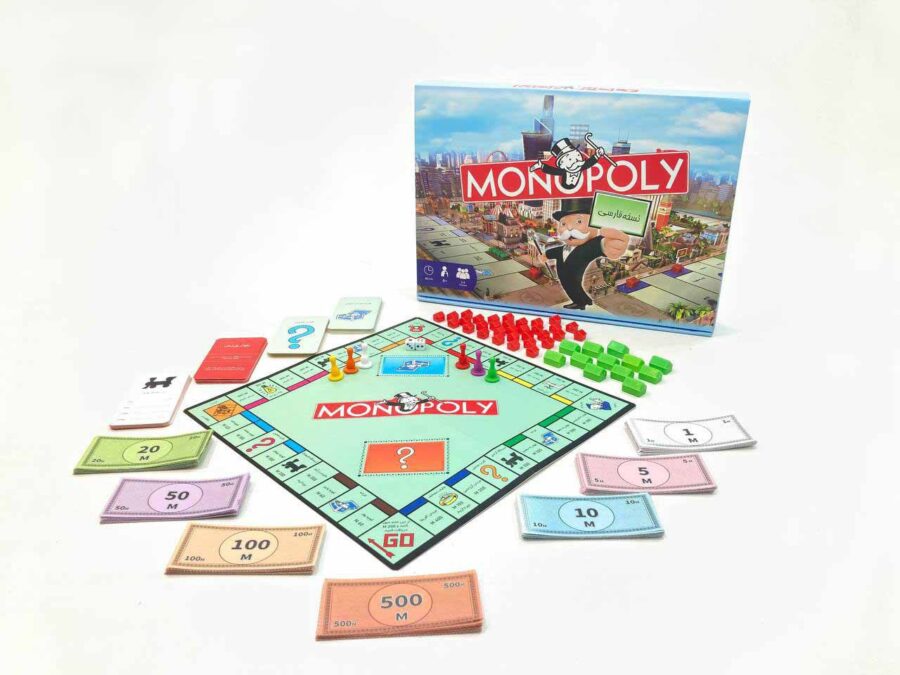 محتویات جعبه: صفحه بازی، پول کاغذی، کارت املاک، مهره و تاس
